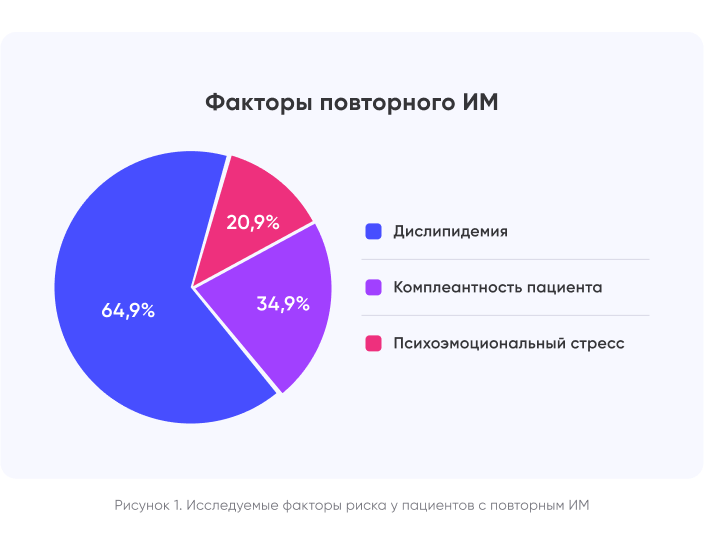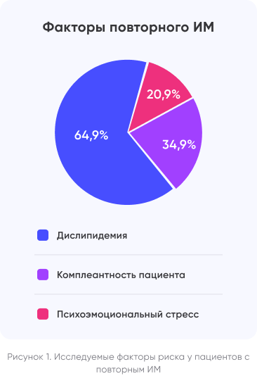 При анализе факторов риска возникновения “повторного” (последующего) инфаркта миокарда у лиц старше 65 лет, которые пережили инфаркт и прожили год без повторной госпитализации из-за острого инфаркта миокарда, выявлены следующие важные аспекты: дислипедимия, гиперхолистеринемия, низкая степень соблюдения рекомендуемой терапии, а также психоэмоциональные расстройства10,11.